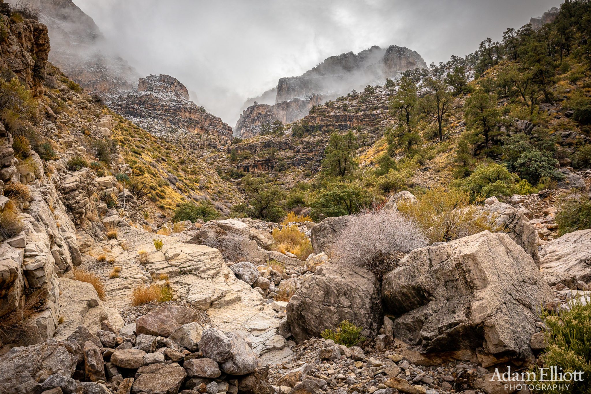 A fantastic scene that suddenly revealed itself. After being in a relatively narrow gorge for so long it seemed crazy for the landscape to be opening up in front of me as i went higher. I could see as I kept moving that it was breaking into three tributary canyons and i was going to have to make a choice about which one to take without being able to see up through the fog.