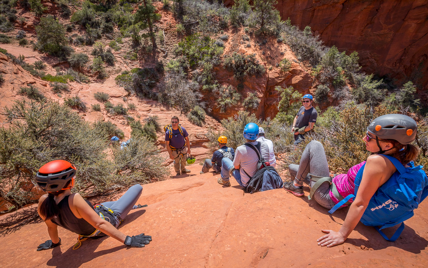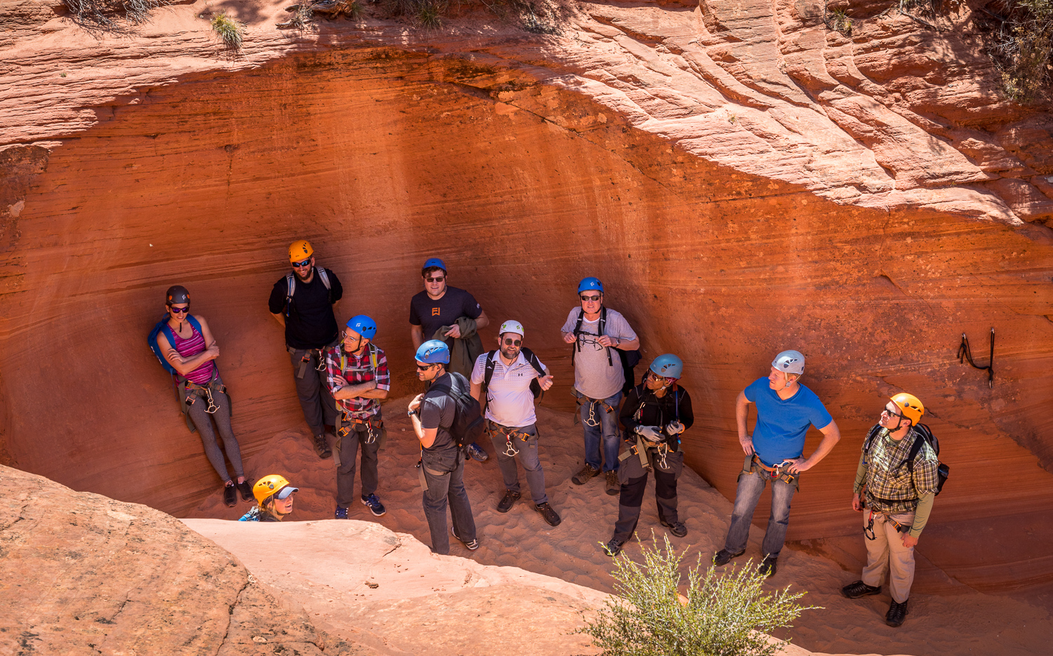 Paul Hatch orients everyone about the longest rappel. Branden Knudsen, owner of Generation Labs, stands on the right.