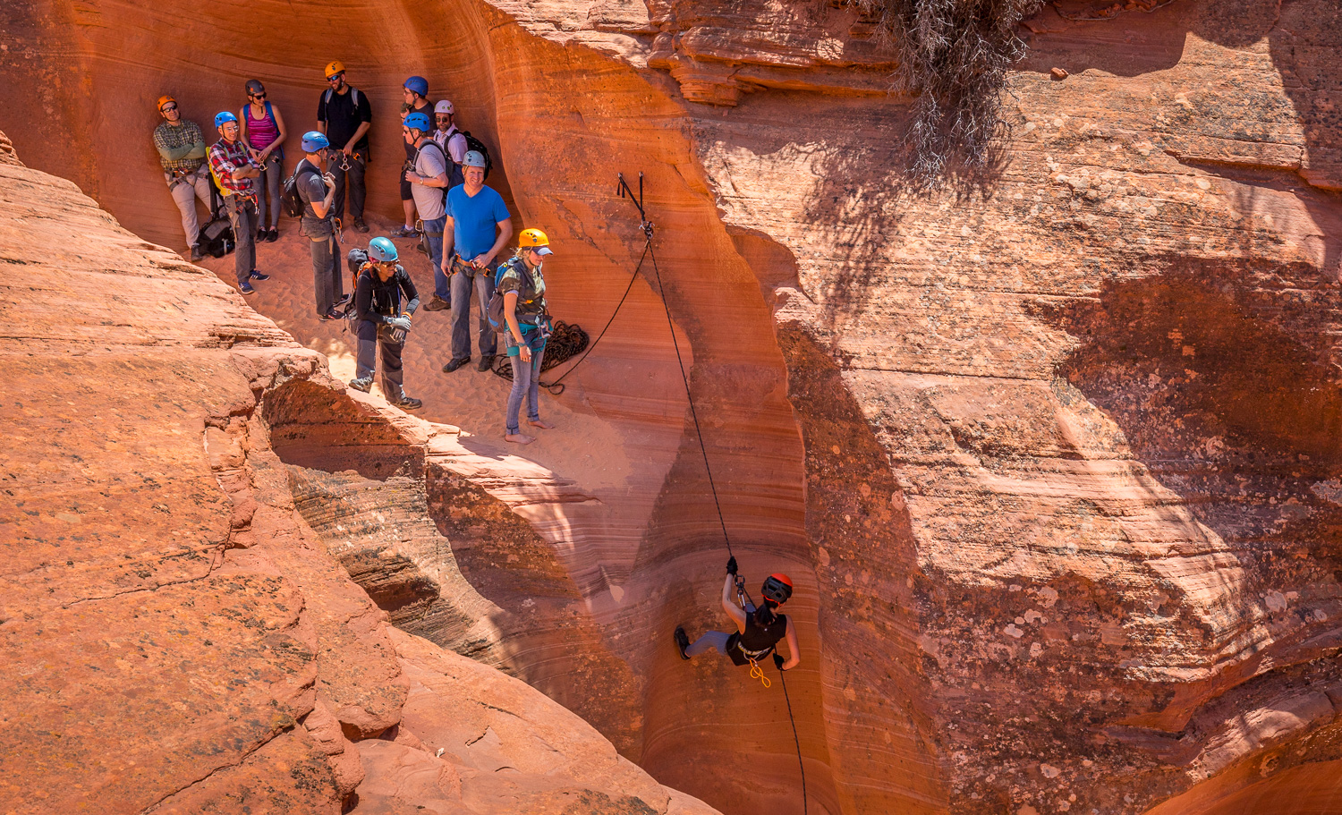 Scott Leavitt of Southwest Tech in Cedar City, navigates the largest rapell and trickiest maneuver of the trip.