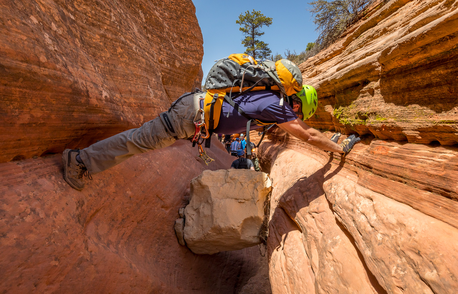 Paul Hatch, owner of Corporate Alliance St. George, stretches out to bypass a choke stone. Paul is an experienced Canyoneer.