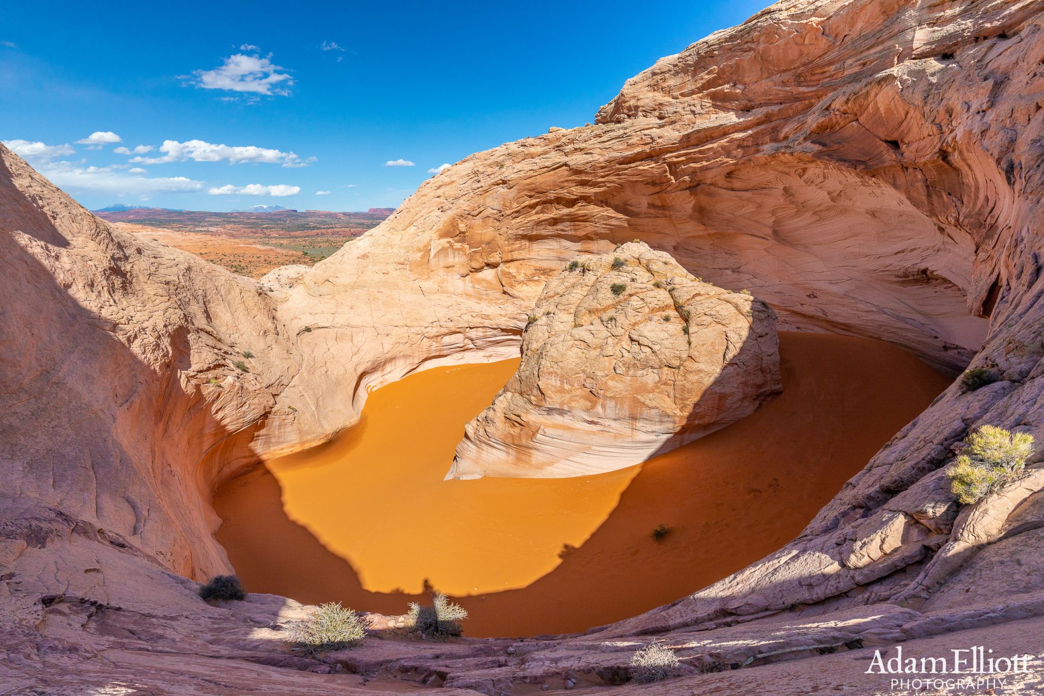 Islomania Dome is a very unlikely work of art produced by wind and water. Started off by a long gone stream that ate itself into a hole, wind took over from there and created massive 200 foot wide bowl of orange sand with a 30 foot high mini butte of rock standing over one side. The lip is sometimes 80 feet above the lowest park but the sand is constantly being blown around in bowl.