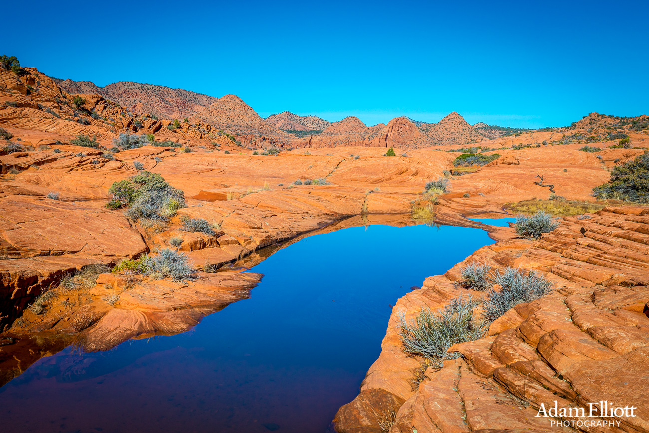 I had intended to go all the way across the slick rock up to the juniper forest in the north. BUT, it was so cool where I was I decided to explore the southern half of the mountain. That was fine, I went up to the area you see here on another day that was brilliantly sunny after a week of rain. There were lots and lots of pools up there. In fact, the title picture is from that day. Yep, I tricked you. But on cloudy days the colors are more vibrant and, except for sunset, I prefer it that way.