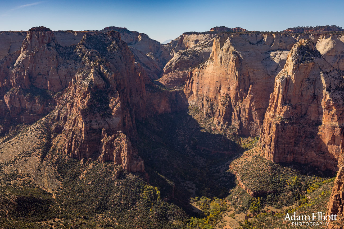 A great, unique view of Zion’s main canyon with the Lodge straight below. On the far right in the distance is Angels Landing, its summit far below. Left of center the skyrocketing tusk of white cliffs is Jacob Peak, which leads over to Lady Mountain. Lady Mountain is on my wish list. Below Jacob the long wall of reddish cliffs is Mt. Moroni. To the left of this whole scene is the header picture of this blog post. If you look back up there that is Court of the Patriarchs and a unique unobstructed view of unvisited Birch Creek Canyon, which drains into the courtyard from high above.