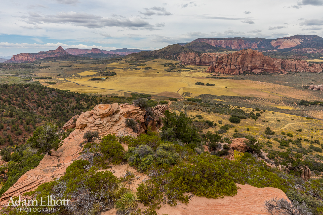 For rock climbing there are routes up all over the walls. But you can hike up to the basin and explore nearly the entire top of the mesa. Once on top there is a confusing array of pinnacles and hoodoos with several that look about the same height, so finding the true summit it difficult. Just to be sure I climbed up three of them. The views are amazing, looking at Cave Valley and the terraces of the Kolob in one to the north and east. To the south and west is a grand vista of Smith Mesa and the desert beyond, all the way to Arizona.